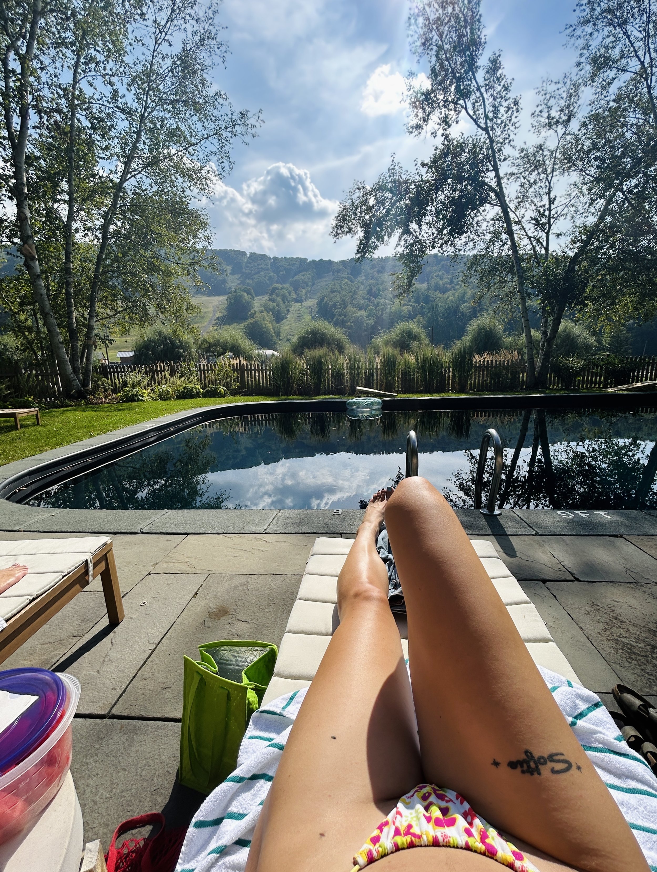 Open from sunrise to sunset, the rectangular pool with a proper shallow and deep end (it was on the property with the Little Cat team took over) sits parallel to the road and the Catamount Mountain. It’s your direct view between the white birch trees opposite the row of lounge chairs. In the summertime, it’s overgrown, Technicolor green grass and snowless ski slopes make for the perfect back drop for a hot, lazy afternoon, soothing without being distracting. (I took the IG reel below there.)